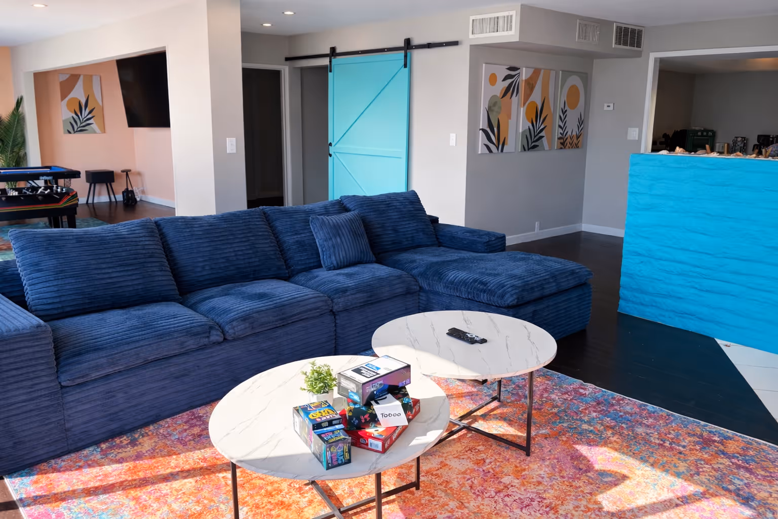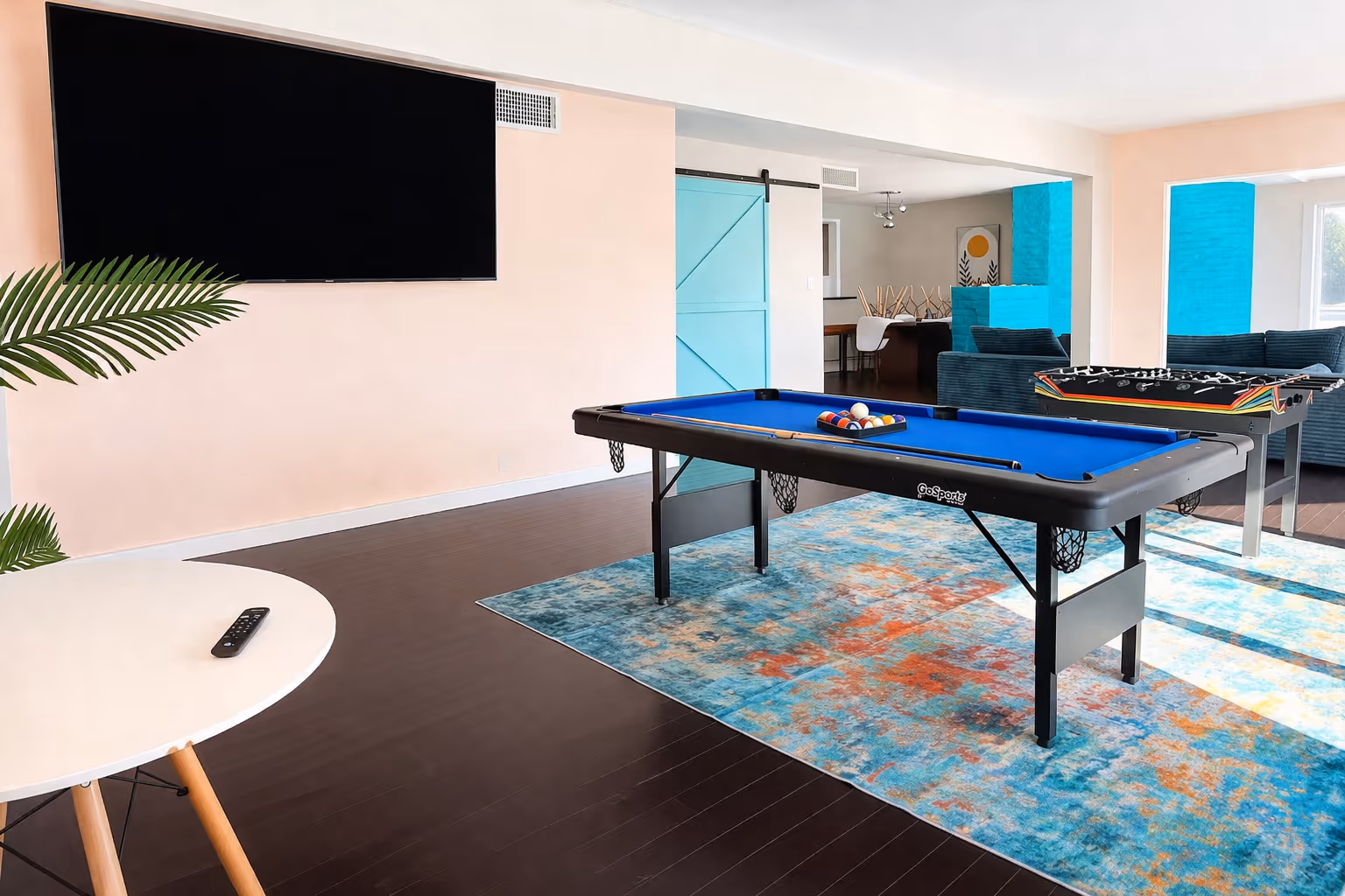 The Presidential Suite is a 1,400 sq ft, poolside three-bedroom designed for groups who want space, comfort, and a fun social vibe. The king primary suite gives you a private retreat, while two additional bedrooms each feature two queen beds—perfect for bringing everyone together. A full-sized kitchen makes it easy to cook, host, and stay longer. The game room, with a pool table, foosball, and a massive 95” TV, is where the energy lives, while the large living room is perfect for winding down. With two full bathrooms and easy indoor-outdoor flow, this is where great stays turn into great memories.